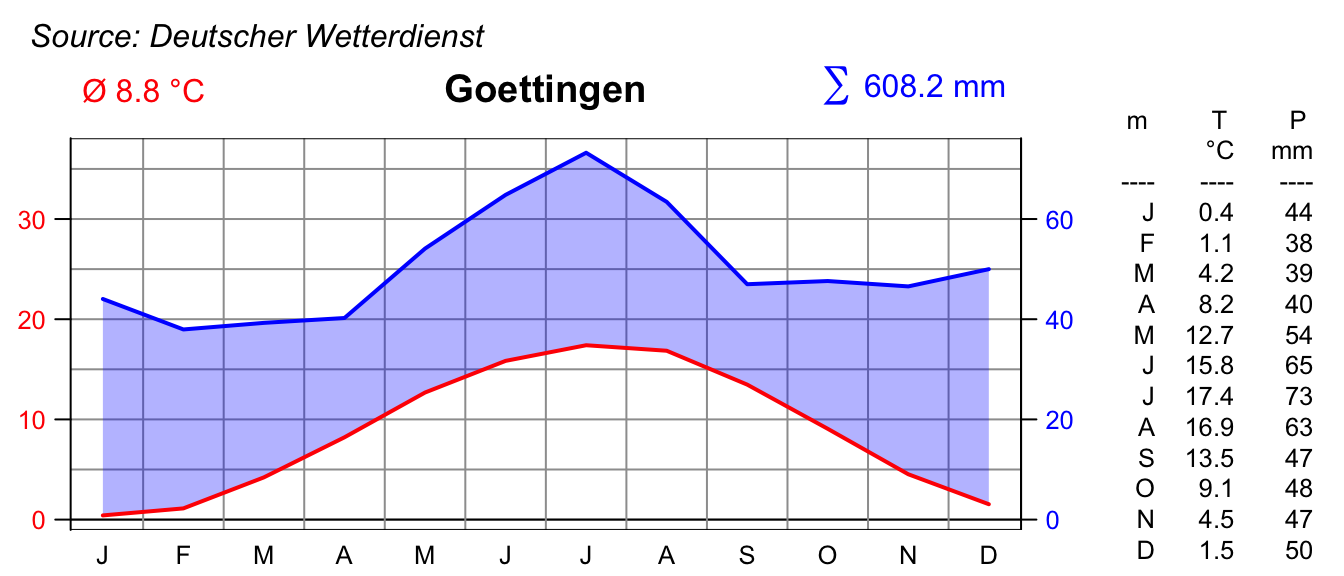 berryFunctions::climateGraph(temp, prec, main="Goettingen")