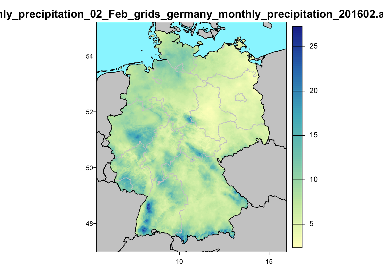 precip <- dataDWD(index[6:8], base=gridbase, joinbf=TRUE)For .asc.gz files, readDWD calls readDWD.raster.