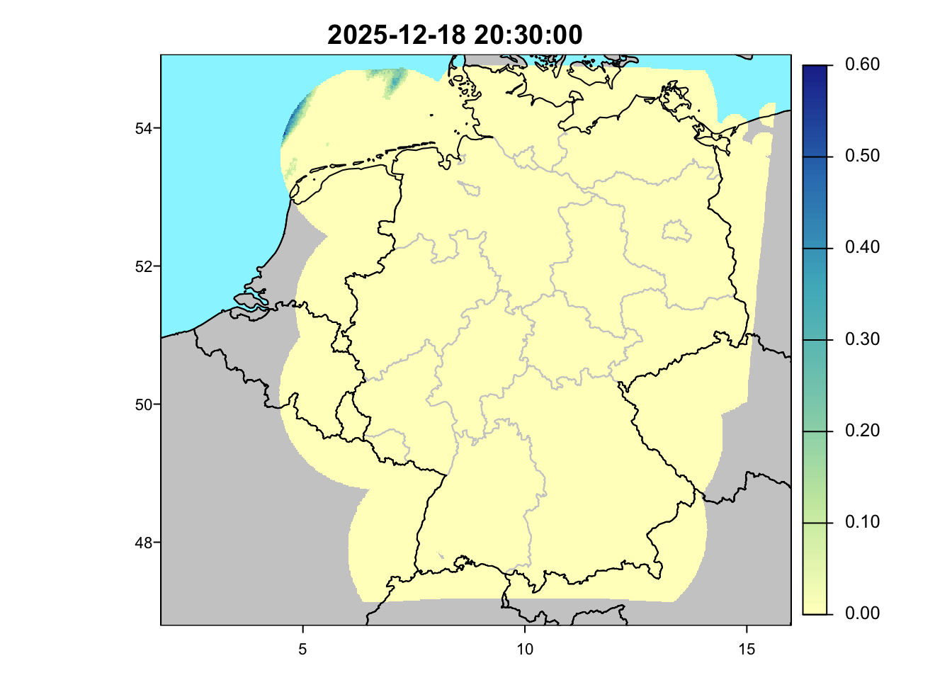 plotRadar(terra::rast(rw_orig$dat), extent="radolan", main=rw_orig$meta$date)